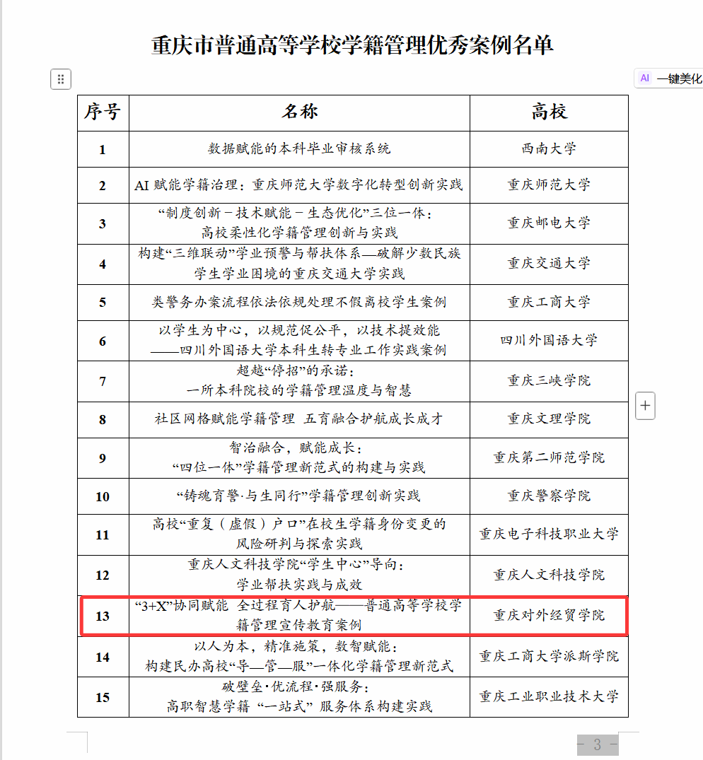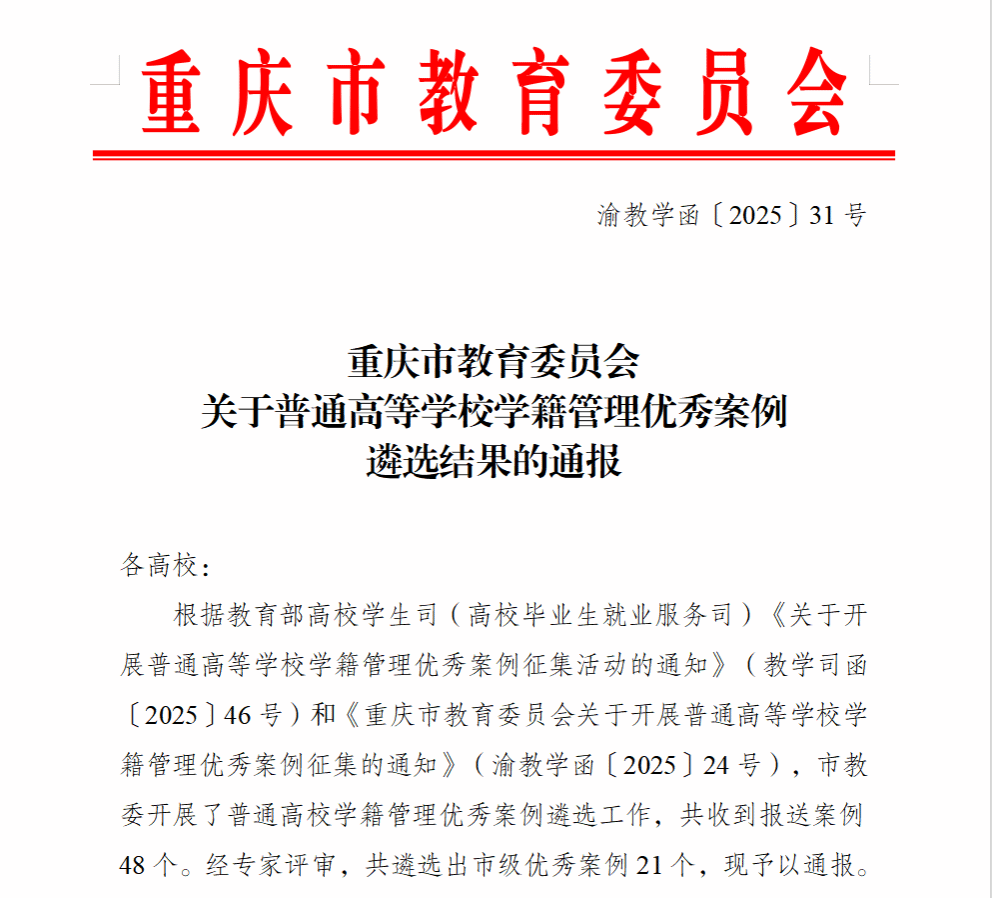 近日,重庆市教育委员会正式通报2025年普通高等学校学籍管理优秀案例遴选结果,我校申报的《“3+X”协同赋能全过程育人护航—普通高等学校学籍管理宣传教育案例》成功入选市级优秀案例,获权威认可!本次遴选共评选出21项优秀成果,覆盖全市各类高校学籍管理创新实践,学校案例凭借鲜明的育人导向、系统的协同机制与扎实的实践成效脱颖而出,成为高校学籍管理宣传教育领域的优秀范例。