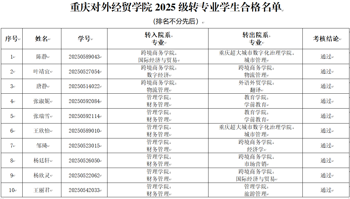 根据《普通高等学校学生管理规定》(教育部令第 41 号)和《重庆对外经贸学院教务处关于认真做好2025级转专业工作的通知》(渝贸院教发〔2025〕—142),经学生个人申请、教务处资格审查、拟转入学院考核、教务处复核、校长办公会审定等程序,现将2025级转专业学生合格名单予以公示。