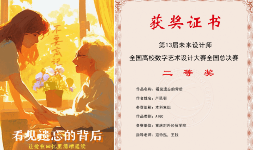 继在“未来设计师・全国高校数字艺术设计大赛省赛”中斩获佳绩后,我院学子再传捷报。近日,第13届未来设计师・全国高校数字艺术设计大赛全国总决赛结果正式公布,2023级虚拟现实技术专业学生卢星羽凭借作品《看见遗忘的背后》,在AIGC赛道荣获全国二等奖,充分展现了我校在数字艺术领域的人才培养质量与全国竞争力。