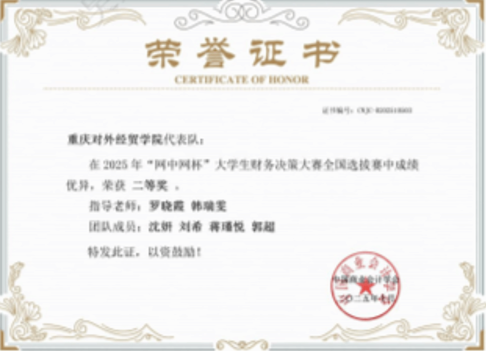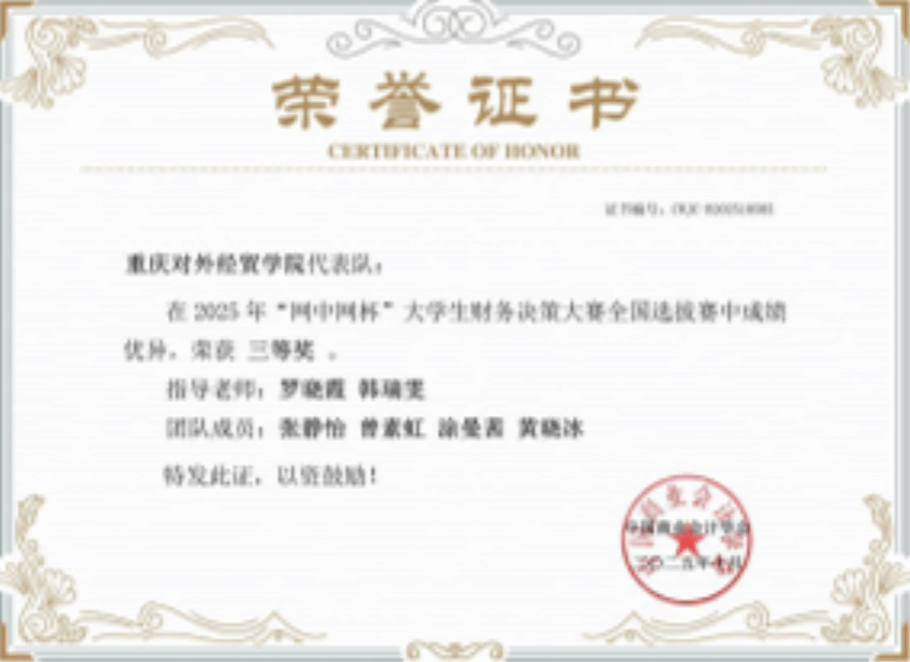 本次大赛涵盖企业战略规划、资金管理、生产运营、财税处理及ESG治理等多维度内容,依托高仿真数字化平台,全面考察学生在复杂商业环境下的综合决策能力。备赛期间,指导教师团队精心组织培训,学生刻苦训练,反复演练经营策略与账务处理流程。比赛中,两支队伍沉着冷静、分工明确、科学决策,在业务运营与社会责任履行方面表现突出,最终从全国众多参赛队伍中脱颖而出,荣获佳绩。