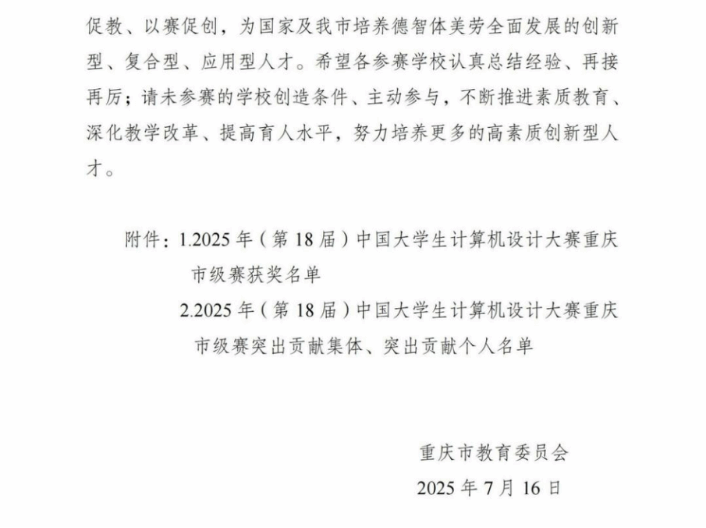 近日,由重庆市教育委员会主办的2025年(第18届)中国大学生计算机设计大赛重庆市级赛圆满落幕。本次大赛旨在以赛促学、以赛促教、以赛促创,为国家及我市培养德智体美劳全面发展的创新型、复合型、应用型人才,吸引了全市27所普通本科高校与6所高职高校的830支参赛队,竞争激烈。
