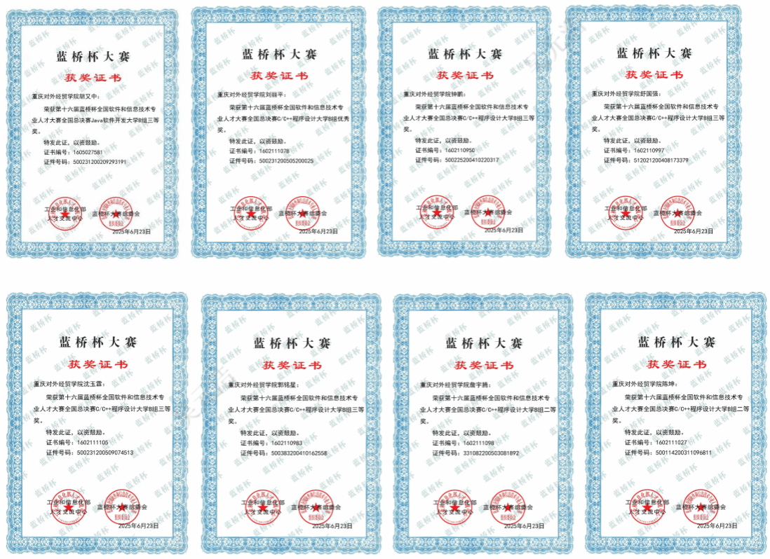 近日,由工业和信息化部人才交流中心主办的第十六届“蓝桥杯”全国软件和信息技术专业人才大赛全国总决赛于2025年6月15日在重庆邮电大学圆满落幕。在我校教务处与数学与计算机科学学院的共同组织与指导下,我校参赛选手表现优异,共8名学生获奖,其中国赛二等奖2项、三等奖5项、优秀奖1项,充分展现了我校学子扎实的专业能力和良好的创新素养。