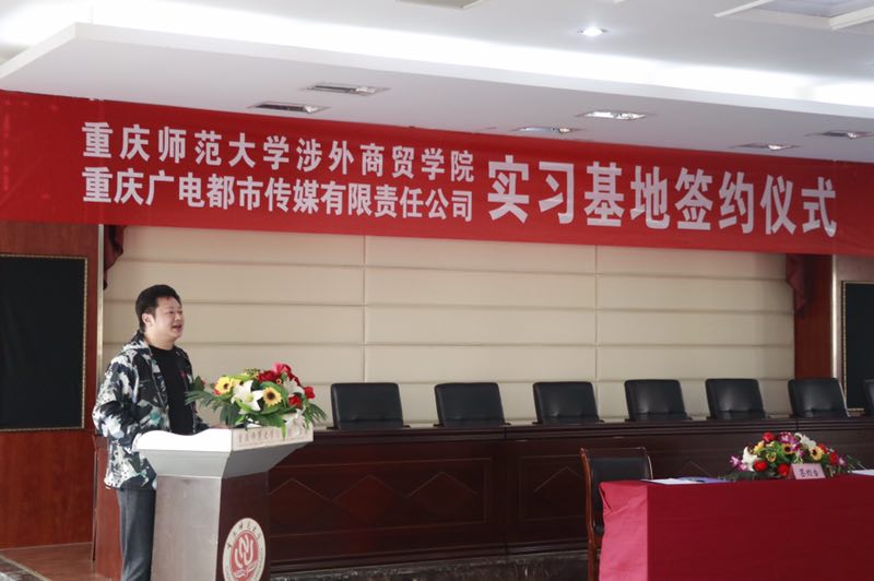 然后,韩咏秋总经理代表公司做了发言,他对学校的周到安排表示感谢,他表示,在党的十九大胜利召开之际,重庆师范大学涉外商贸学院与重庆广电都市传媒有限责任公司签署实习基地合作协议具有重要意义,双方拥有深厚的历史渊源和坚实的合作基础,自启动合作进程以来,双方领导班子都给予了高度的重视,并倾注了大量的心血,希望今后强强联合,优势互补,在紧密合作中谱写辉煌的篇章,为社会培养出更多优秀人才。