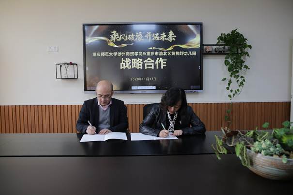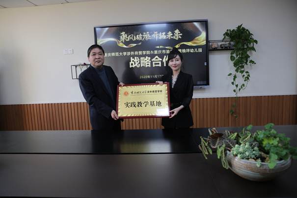 11月17日,重庆师范大学涉外商贸学院与渝北区黄桷坪幼儿园签订合作协议书,并为该幼儿园授牌设立教育实践基地。黄桷坪幼儿园园长唐春梅、副园长艾渝,学校副校长杜斗恒,教务处副处长彭高中,学前教育学院副院长刘娜、教师代表陈奇参加了签约、授牌仪式。