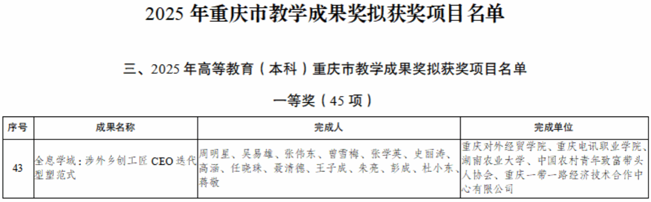近日,重庆市人民政府近日公布了2025年教学成果奖表彰名单,我校牵头完成的《全息学域:涉外乡创工匠CEO迭代型塑范式》喜获高等教育(本科)一等奖。