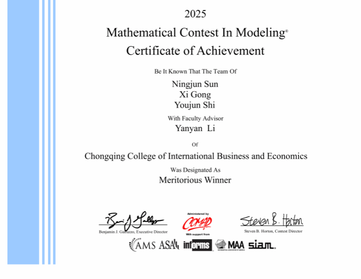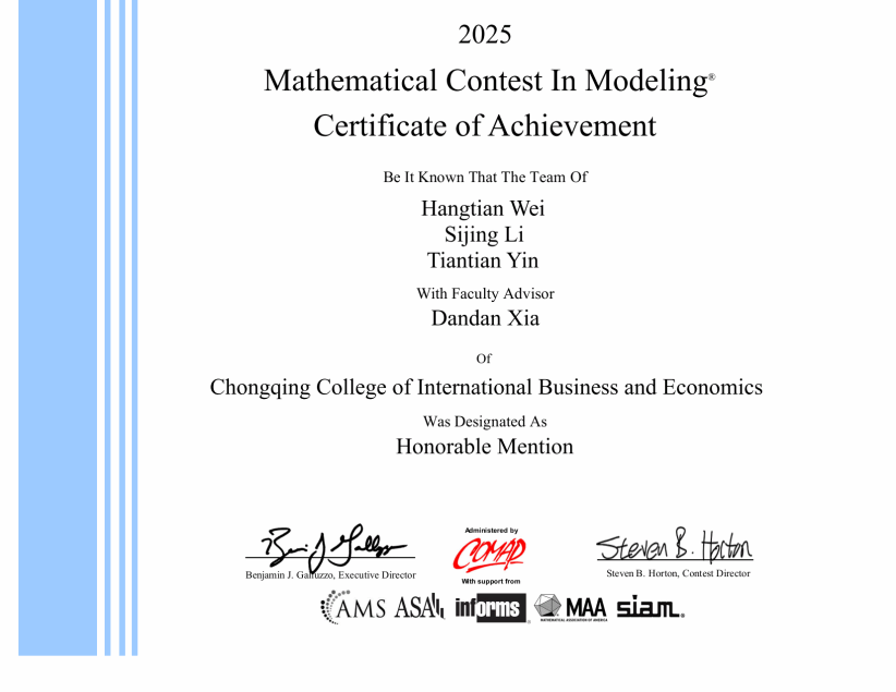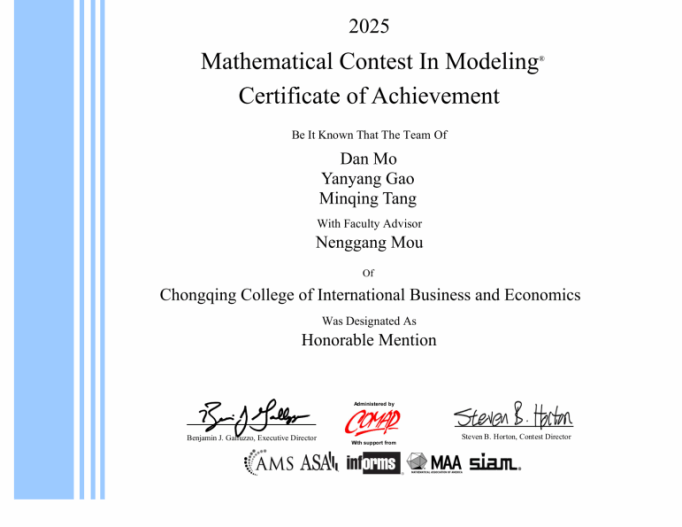 尤为值得一提的是,此次荣获的国际一等奖(M奖),是我校在该项赛事中首次实现国际一等奖的重大突破。这一里程碑式的成就,不仅彰显了我校学子在国际学术舞台上的强劲实力与无限潜力,更刷新了我校在该项权威赛事中的历史最佳成绩,为学校在该赛事的荣誉簿上书写了新的篇章!
