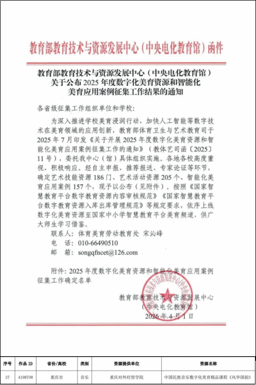 此次入选,是对我校美育工作扎根本土、守正创新的充分肯定,也彰显了学校在数字化美育资源建设与教学改革中的显著成效。未来,学校将继续坚持立德树人根本任务,持续深化美育教学改革,产出更多高质量数字化美育成果,为提升学生审美素养、传承民族文化精髓贡献力量。