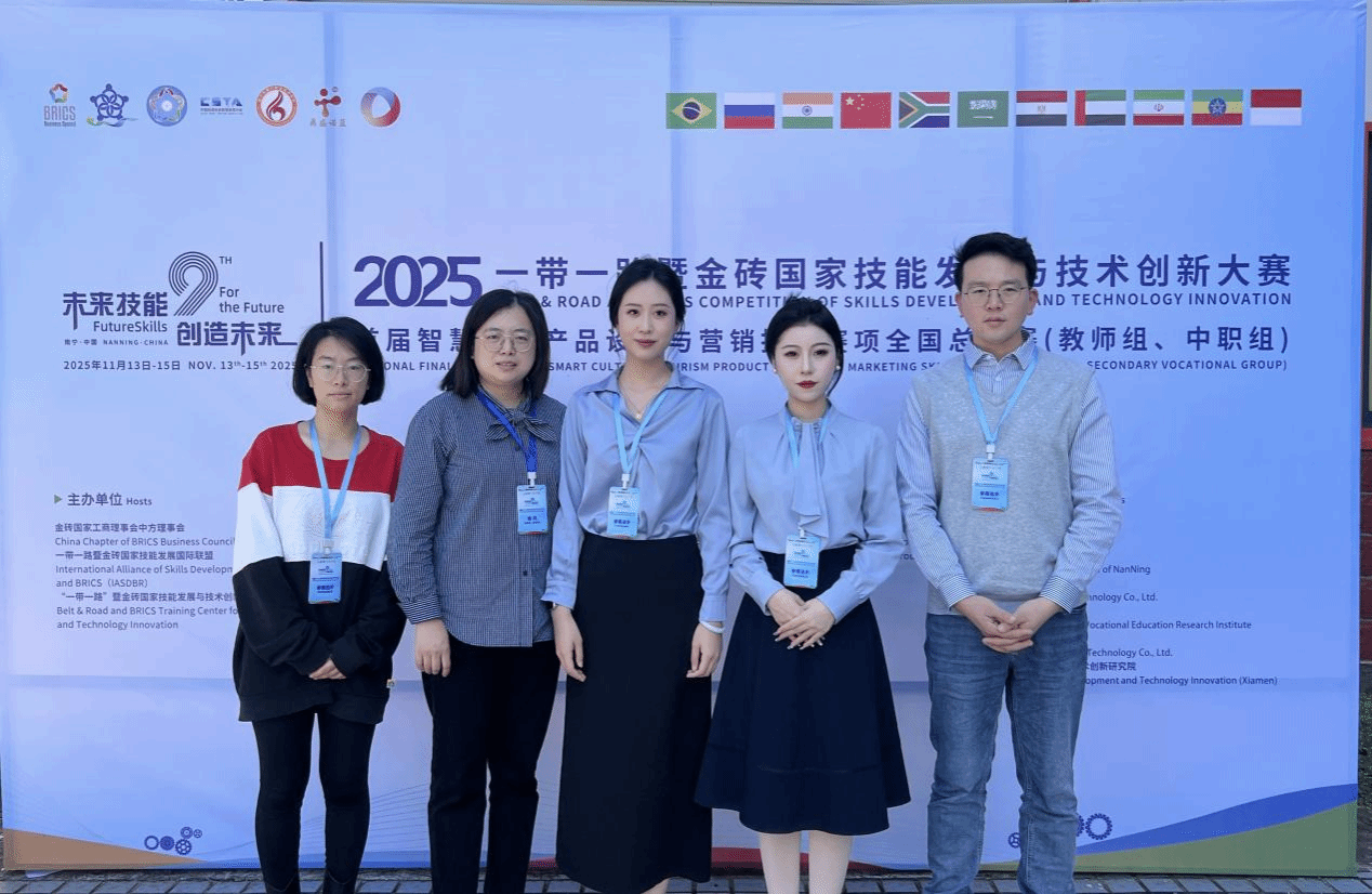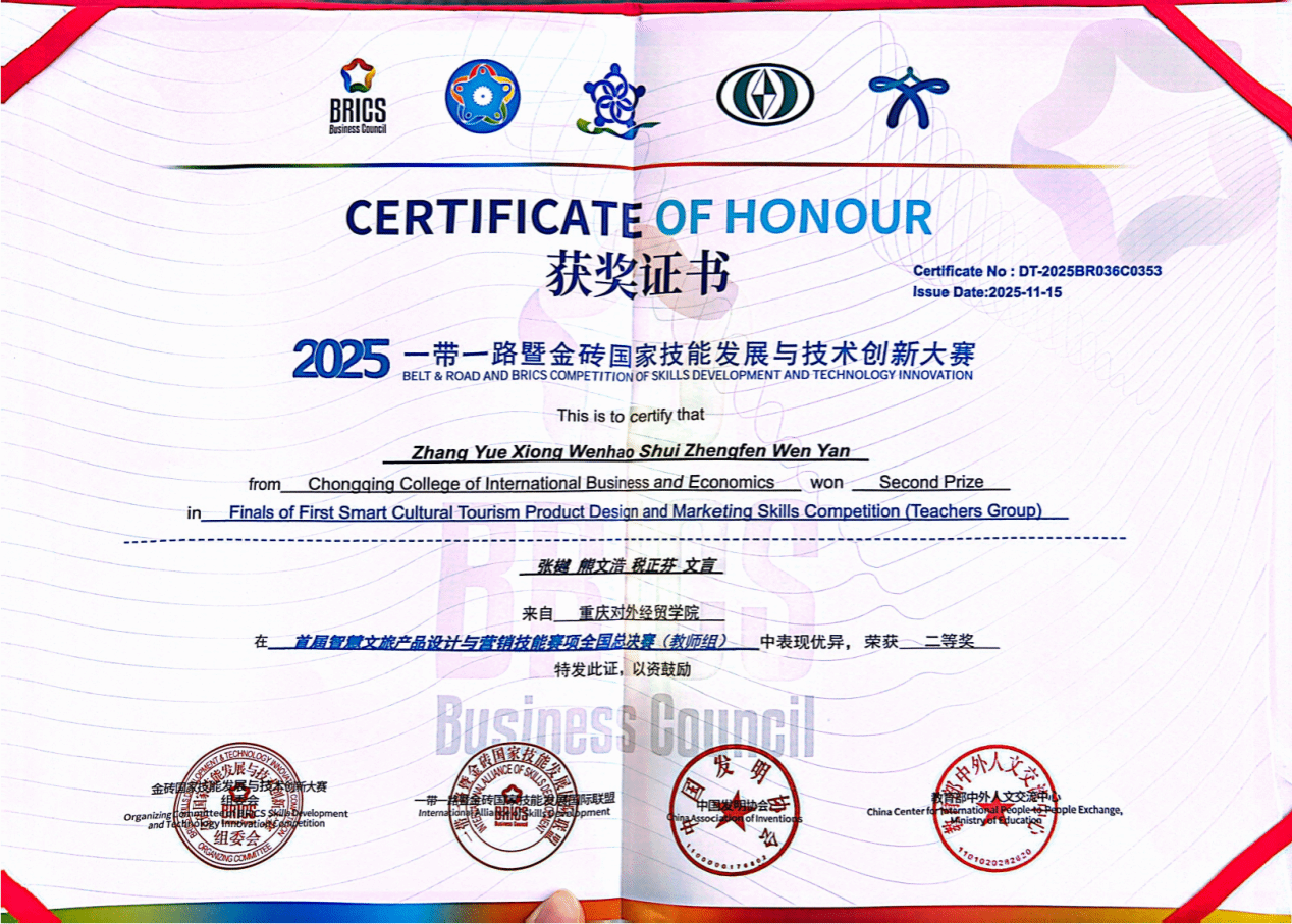 在2025年第九届金砖国家技能发展与技术创新大赛——首届智慧文旅产品设计与营销技能赛项全国总决赛中,学校管理学院熊文浩、文言、张樾、税正芬四位教师组成的团队,凭借扎实的专业基础和出色的创新能力,荣获教师组二等奖(银牌),学校同时获得“优秀组织奖”。团队在备赛与参赛过程中坚持严谨细致、协作高效,在智慧文旅产品创意设计、市场分析与营销策划等方面表现突出,赢得评委一致认可,取得优异成绩。