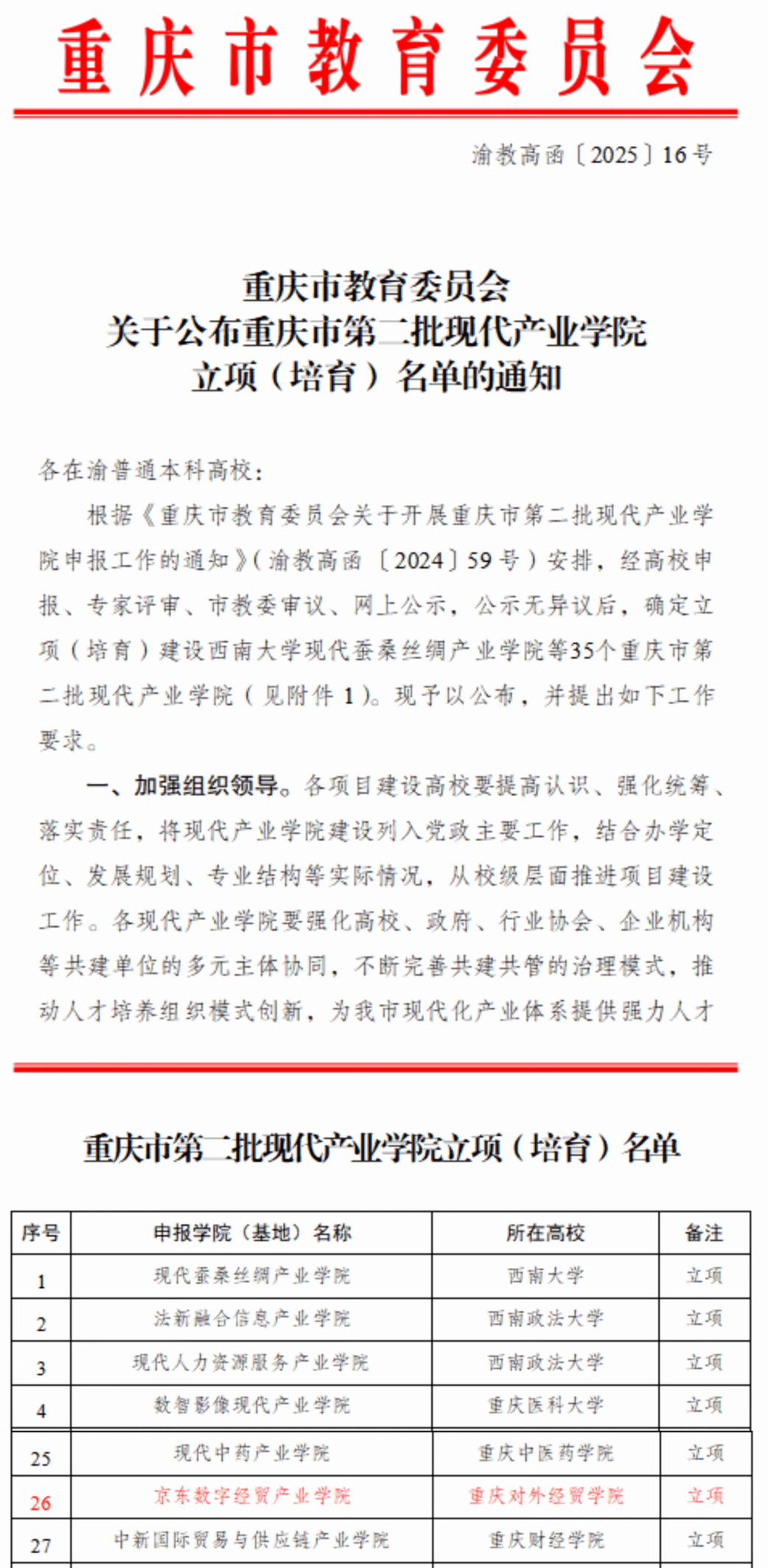 近日,重庆市第二批现代产业学院立项名单正式公布,学校跨境商务学院申报的“京东数字经贸产业学院”成功获批立项。