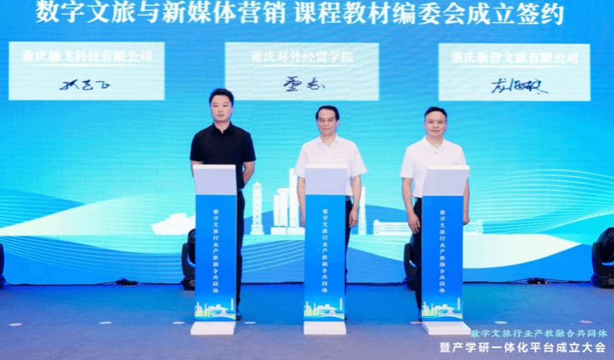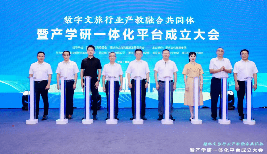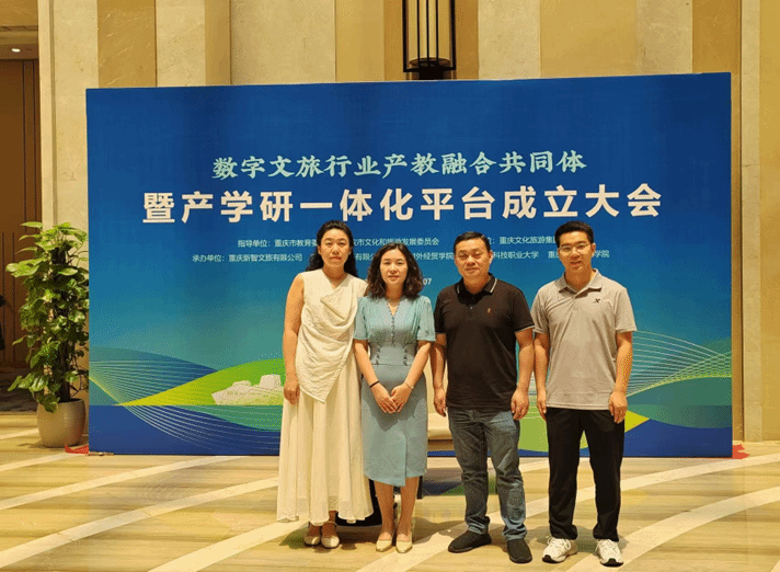 7月14日,由重庆市教育委员会、重庆市文化和旅游发展委员会指导,重庆文化旅游集团主办,重庆新智文旅有限公司、重庆楠飞科技有限公司、重庆对外经贸学院等单位联合承办的“数字文旅行业产教融合共同体暨产学研一体化平台成立大会”在重庆江北区隆重举行。我校作为承办单位之一,由执行校长董志教授带队,学校校企合作服务中心负责人成洪波,跨境商务学院院长赵逖,跨境商务学院党总支副书记王德印陪同,全程参与了此次盛会。