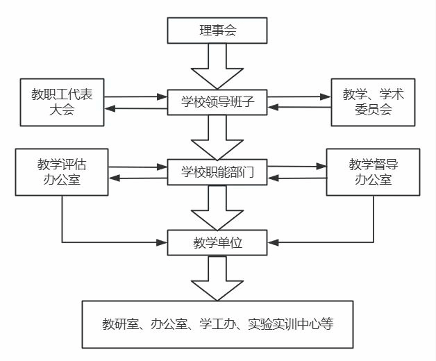 1.管理层。管理层分为决策层和职能管理层。决策层:董事会、学校领导班子主要负责学校发展的宏观策划,校长重在实施与管理,党委重在党建与思想政治工作,其决策咨询机构有教职工代表大会、学术委员会、教学委员会、教学督导委员会等。职能管理层:学校职能部门主要依据自身所承担的管理职能,落实学校决策层的各项决定。其中教学质量管理机构有教学评估办公室、教学督导办公室等。党政办公室承担目标管理和年度考核职责。