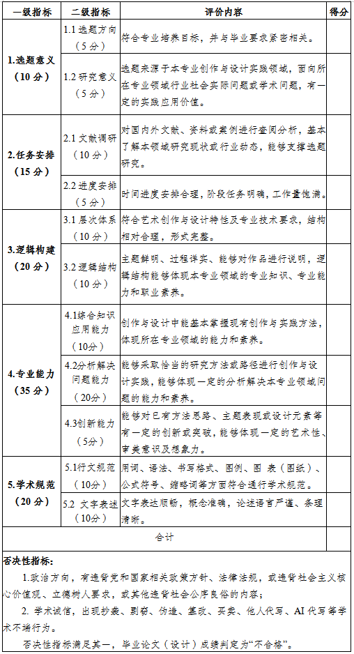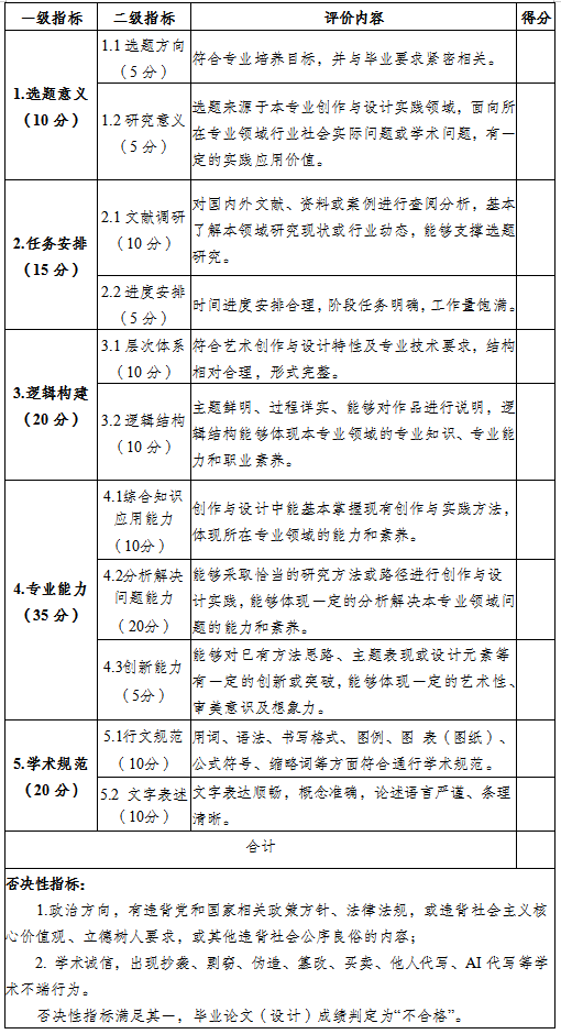 否决性指标: 1.政治方向,有违背党和国家相关政策方针、法律法规,或违背社会主义核心价值观、立德树人要求,或其他违背社会公序良俗的内容; 2. 学术诚信,出现抄袭、剽窃、伪造、篡改、买卖、他人代写、AI代写等学术不端行为。 否决性指标满足其一,毕业论文(设计)成绩判定为“不合格”。 |