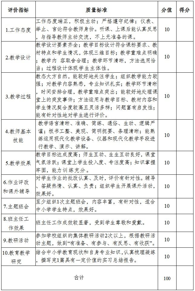 5.实习成果 | 实习手册填写规范工整;对平时的工作资料收集整理齐 全;能提交优秀教案、育人案例、实习示范课、优秀实习日志和优秀教研成果等实习成果(至少提交1项)。 | 20 |